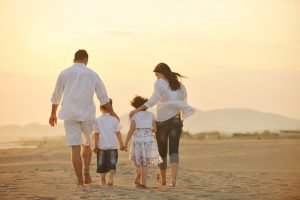 happy young family have fun on beach at sunset